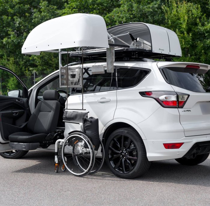 secondi, un braccio aggancia la carrozzina piegata, la solleva e la ripone all’interno del box fissato sul tetto della vettura.